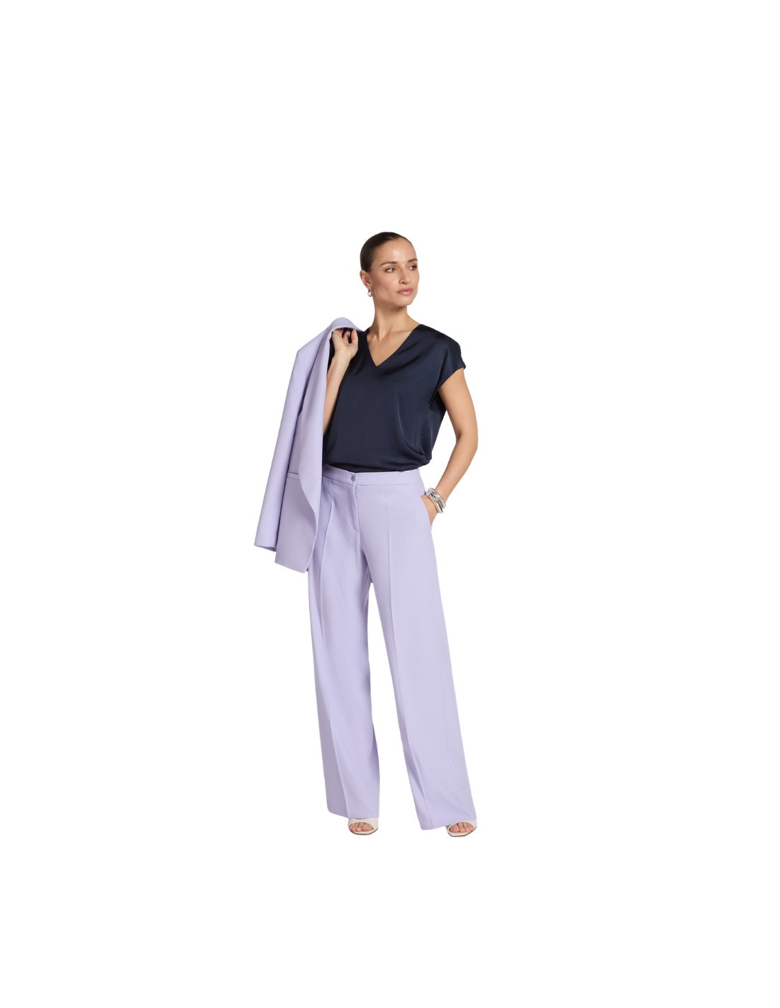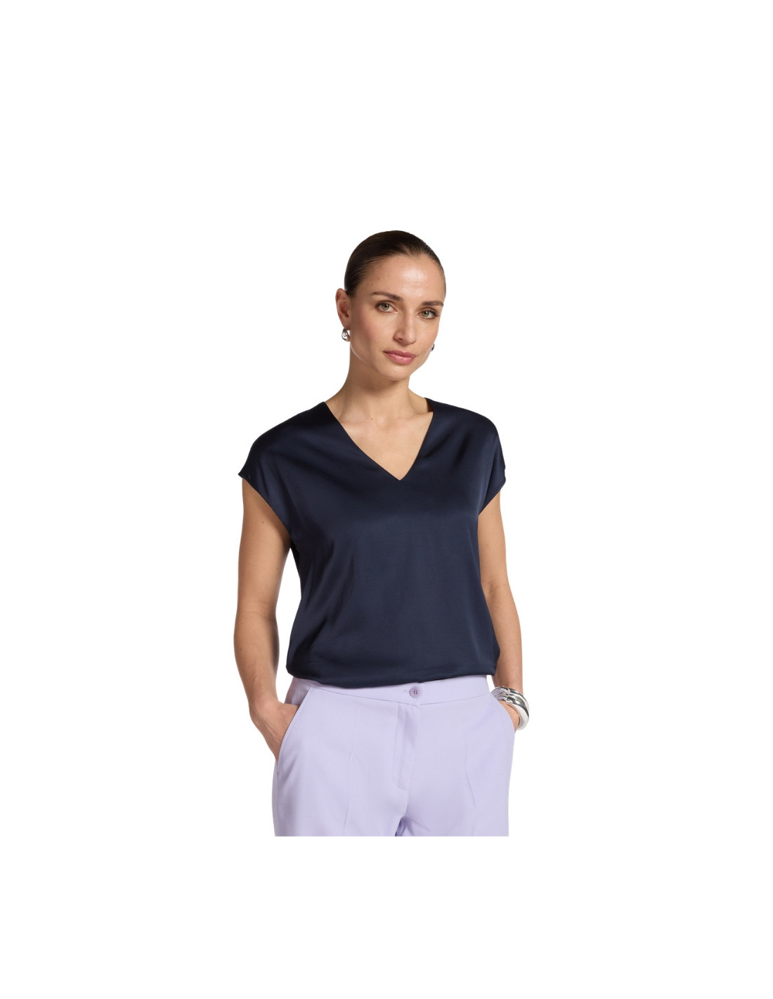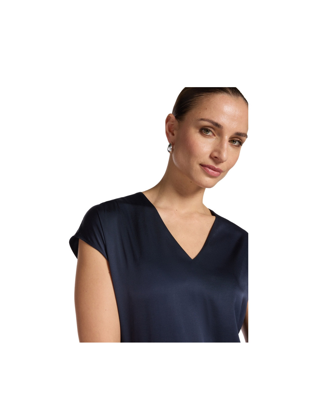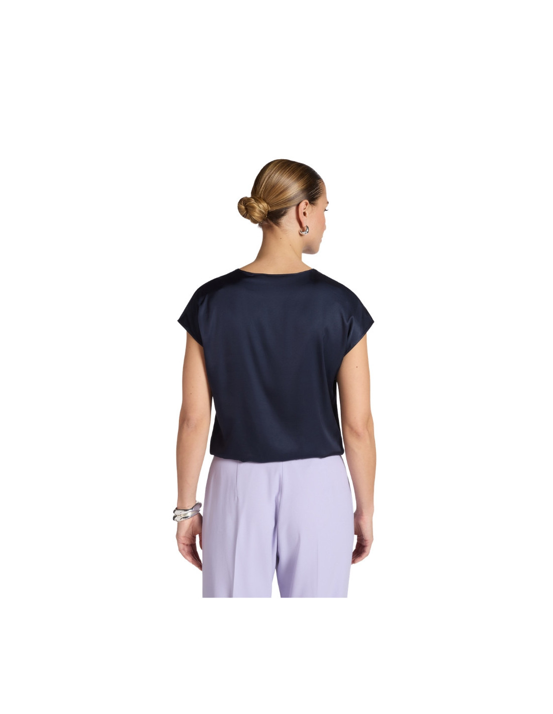 Eleganza minimal e raffinatezza contemporanea definiscono la blusa con scollo a V color blu notte, un capo essenziale dal fascino sofisticato.
