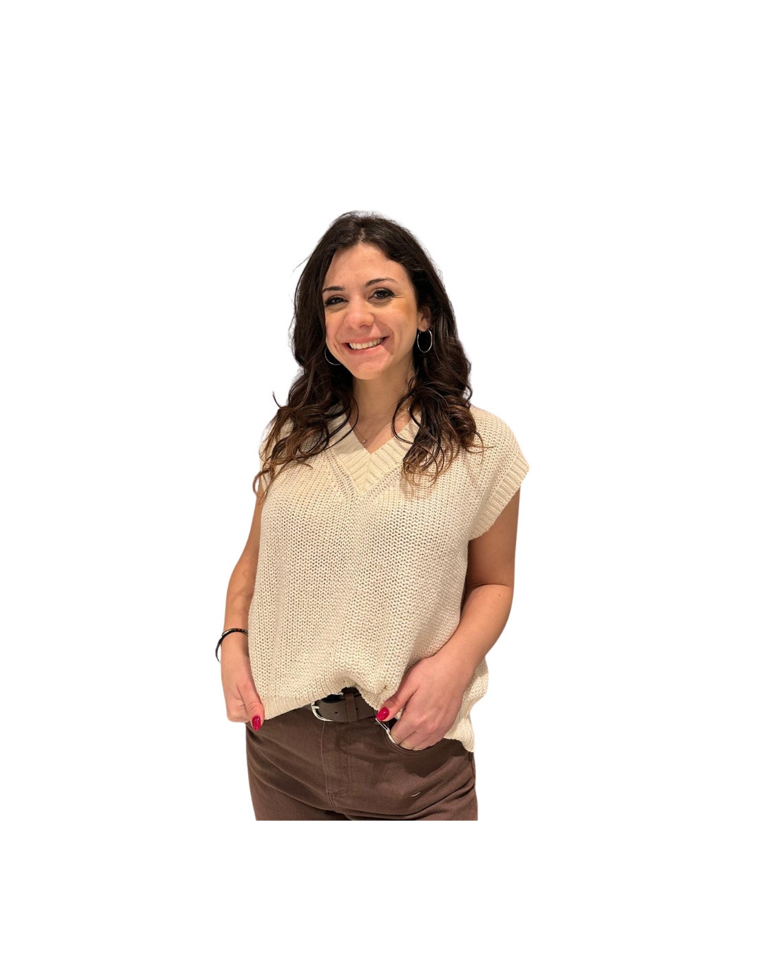 Scegli l'eleganza senza sforzo con questo gilet in maglia, un pezzo chiave per i tuoi outfit quotidiani. La tonalità latte e la texture lavorata lo rendono un capo di carattere, perfetto per chi cerca un look moderno e curato .Il design presenta uno scollo a V con bordo a costine che aggiunge struttura e definizione, rendendolo ideale da abbinare a una t-shirt basic o a una camicia per un gioco di volumi impeccabile.