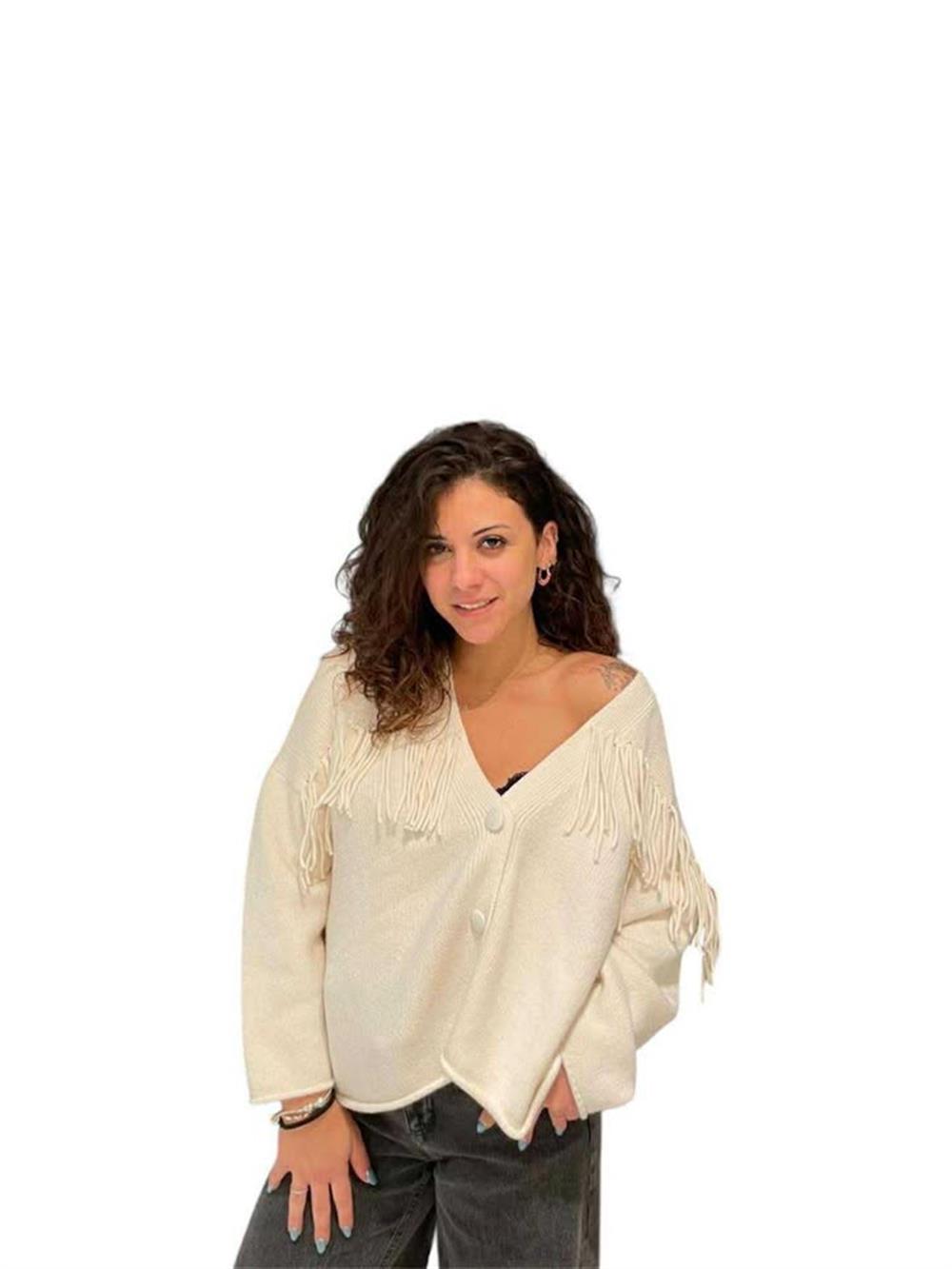 SKU: 23301 Categories: Abbigliamento, Autunno Inverno 2025/2026, Cardigan, LE STREGHE Tags: abbigliamento donna, Cardigan, Cardigan con frange, glamour, lestreghe